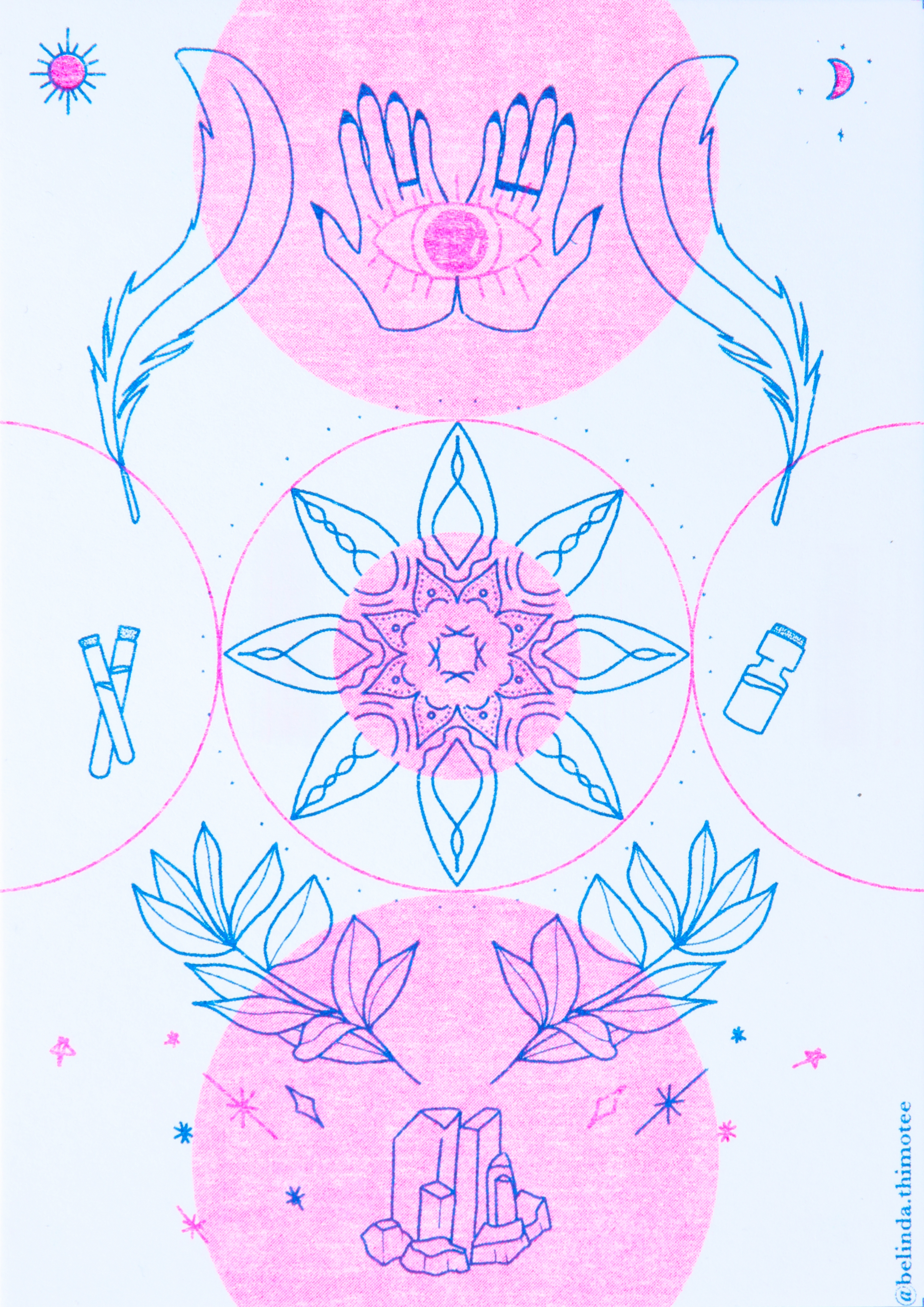 ILLUSTRATION — MAY 2022 This design represents symbols of healing and magic. In the center is Anahata the heart chakra. The bay leaves and crystals are powerful energy cleansers.