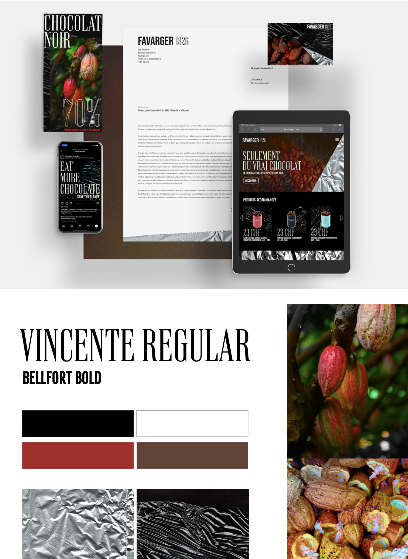 VISUAL IDENTITY — DECEMBER 2021 For this project, the classic meets the modern. This visual identity that stands out and is innovative in the world of chocolate. The mix of these two worlds meets, using artisanal, refined and electric textures.