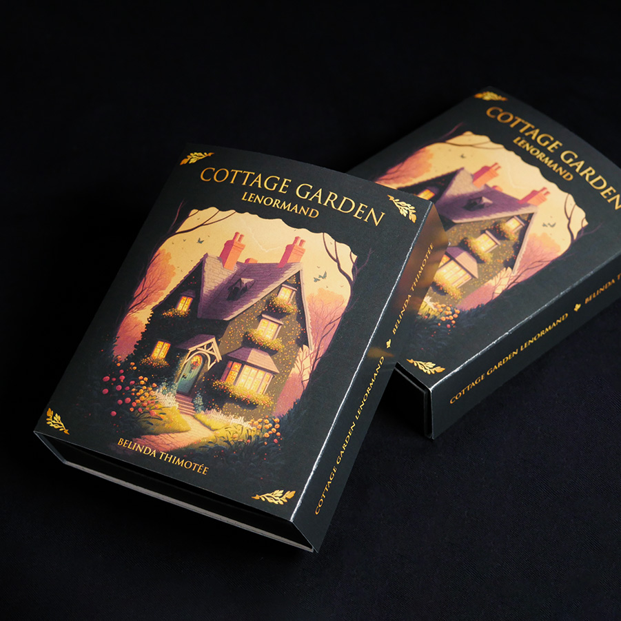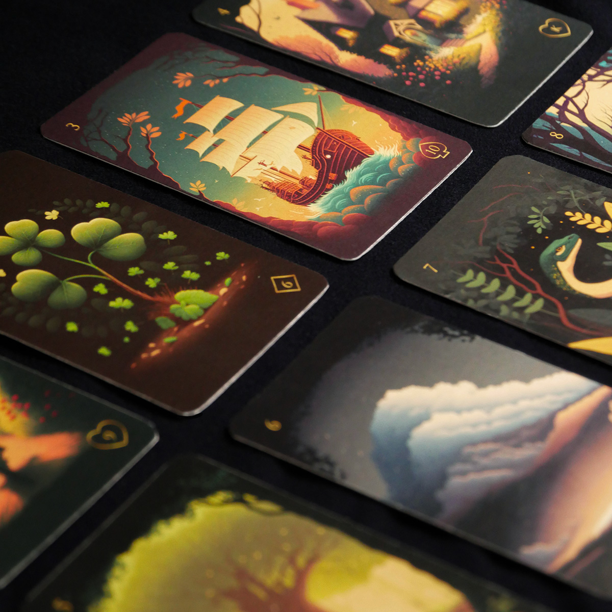 CARD GAME & AI — DECEMBER 2022 Inspired since my adolescence by the game of Mademoiselle Lernomand, I decided to create my own game linking the traditional symbols of the game with a cottagecore aesthetic. The visuals were made with Midjourney (AI) and allowed me to create a complex and detailed universe that can be declined infinitely. Each card allows for numerous readings and interpretations, they each have their own story and allusions.