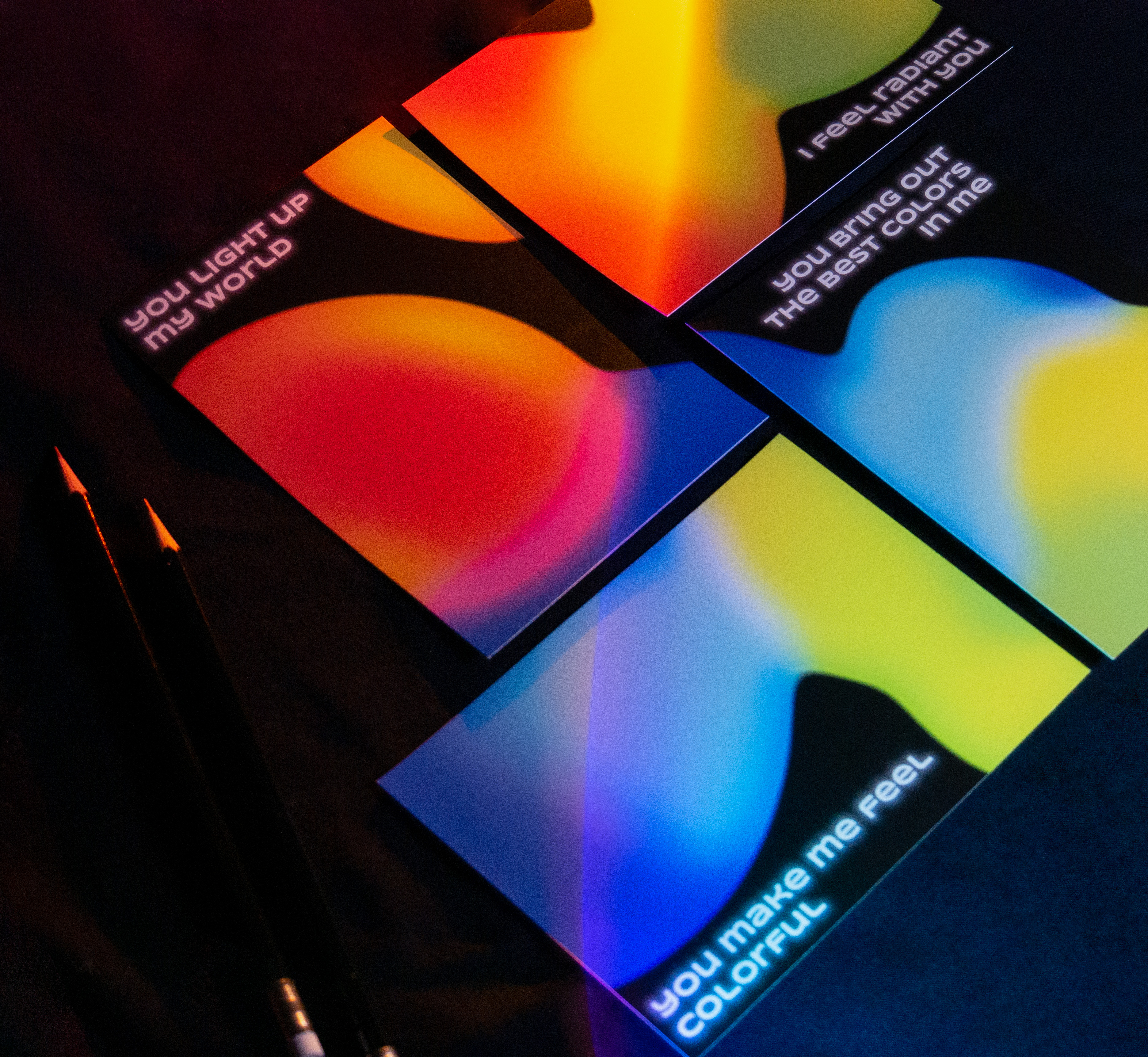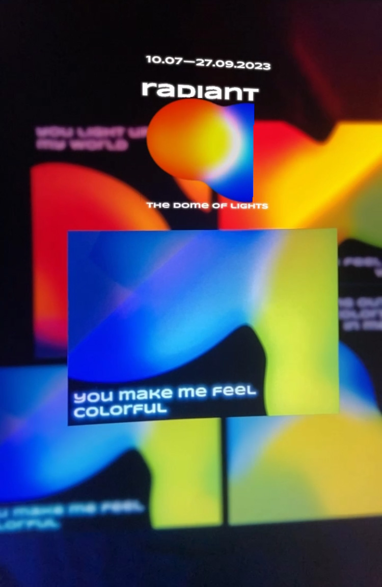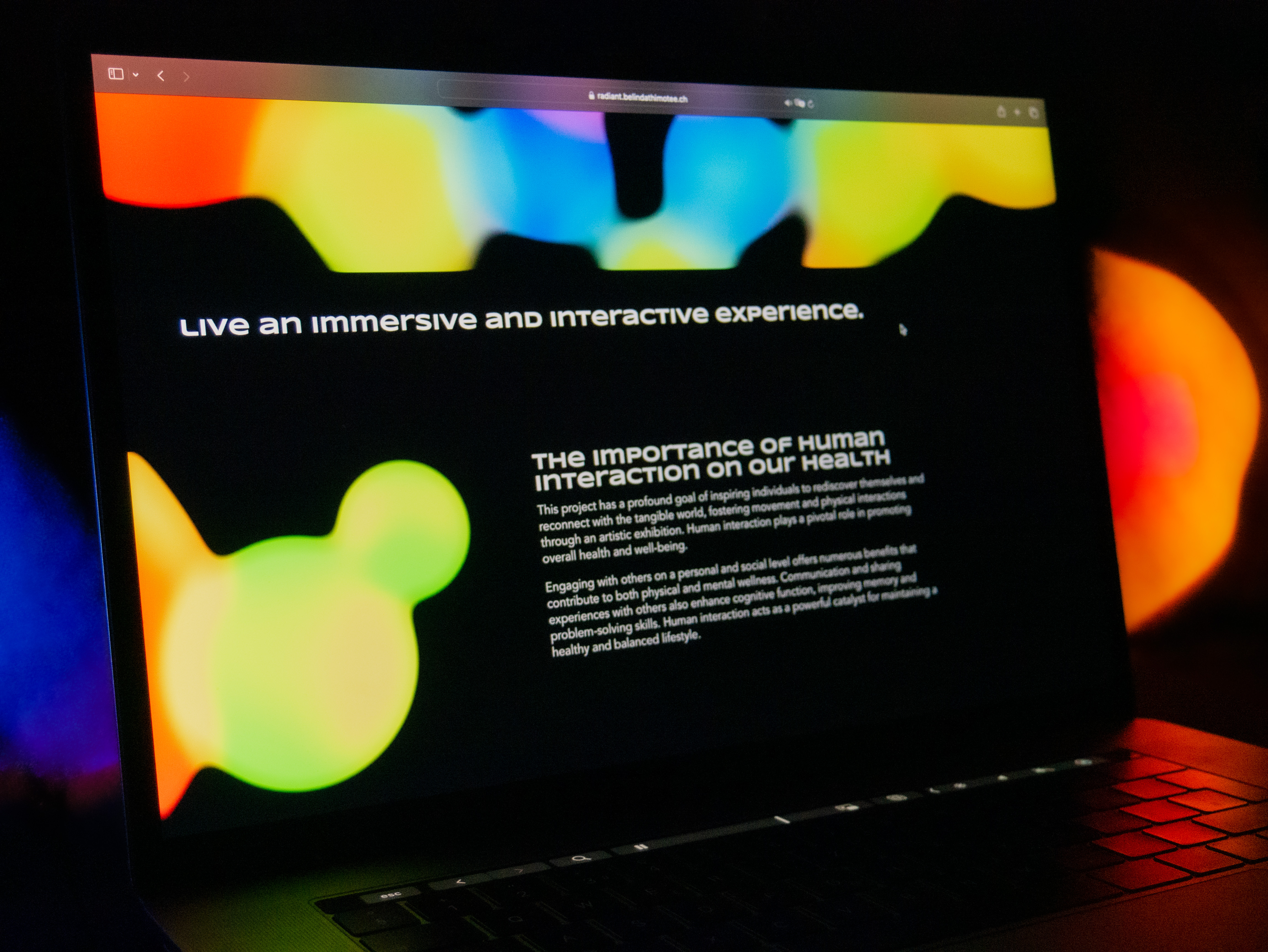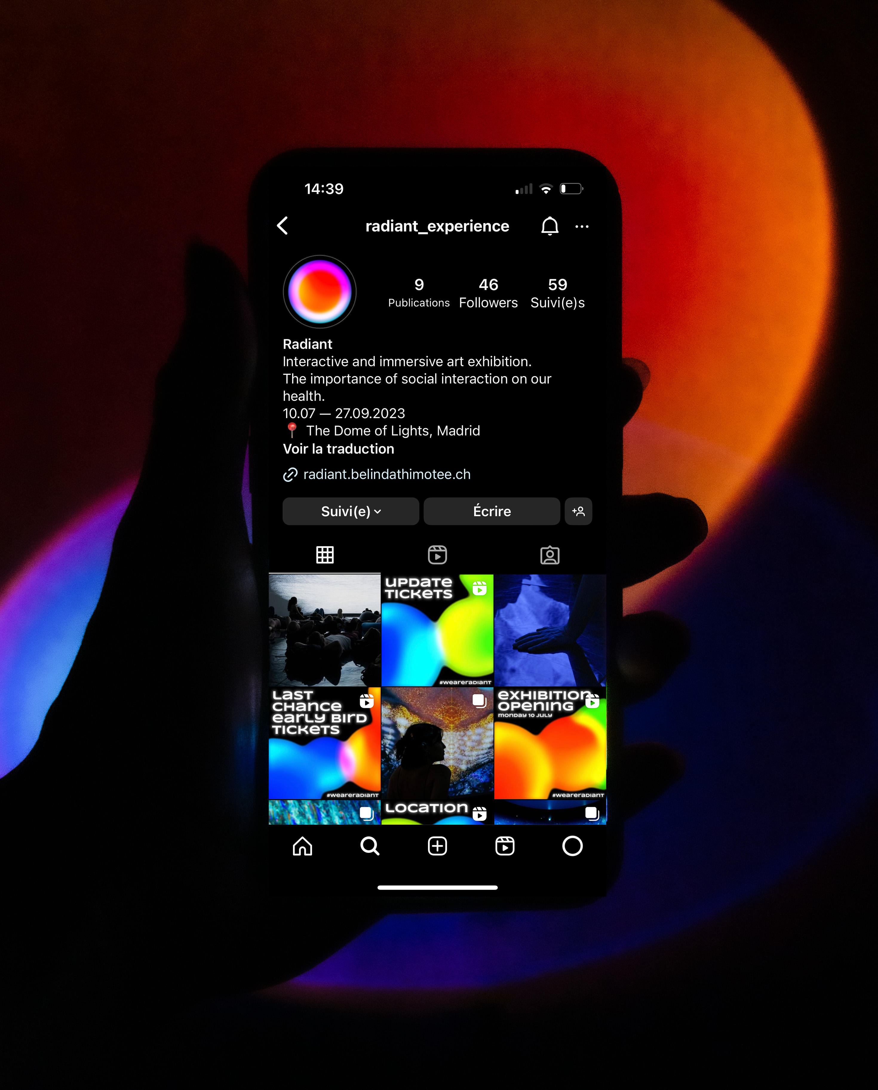 This project consists of the creation of a visual identity for a fictitious immersive exhibition called Radiant. This highlights the importance of social interactions on our health. Through color and movement, it allows visitors to experience these interactions in an interactive and immersive way, with other people or alone in its spaces.